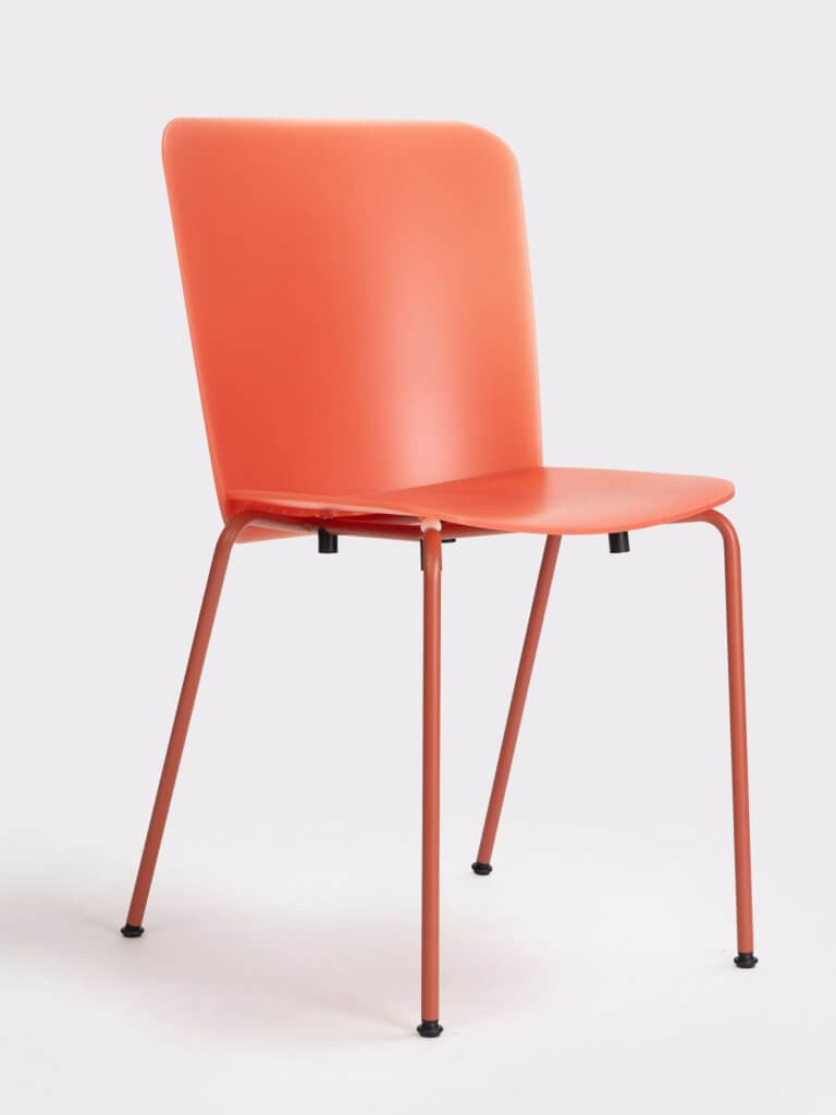 スチールの4本脚チェアは、20脚までスタッキング可能。トロリーや連結パーツと組み合わせることで、レイアウト変更や収納といったコントラクト空間の運用にも適しています。